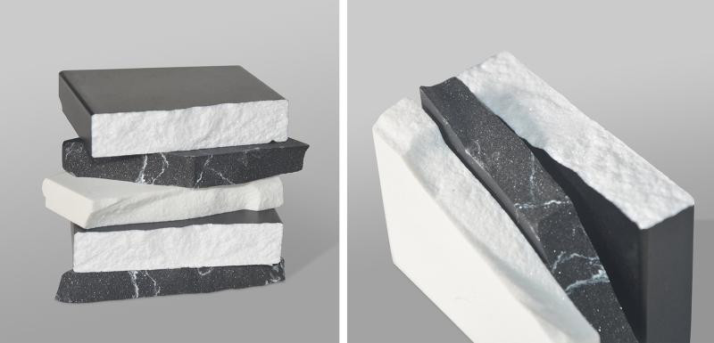 A kompakt márvány 97% újrahasznosított márványőrlemény és 3% természetes gyanta keverékéből készül. A termékek festése kerámia festékkel történik.